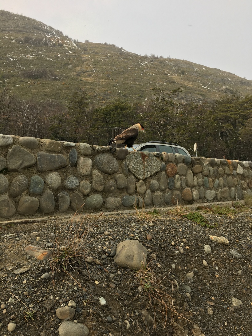 Там погревшись и перекусив мы вышли к нашему аргентинскому водителю. Прям возле машин находились крупные птицы. Подойдя поближе, я поняла, что они не боятся и не улетают. Кинув им еды я сняла их на видео очень близко. Это были очень красивые, крупные и важные птицы. Тут их называют el corancho ( caracara).