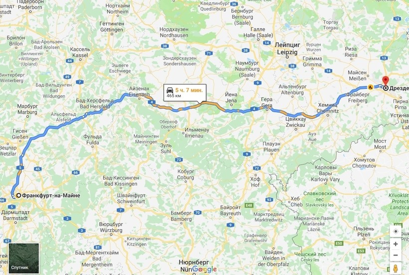 На арендованной машине я ездила в Дрезден из Франкфурта-на-Майне, это 465 км. Поездка длилась от 8 утра до 14 часов дня.