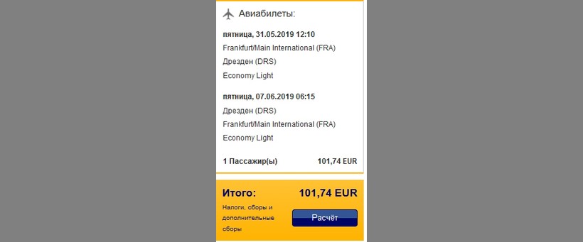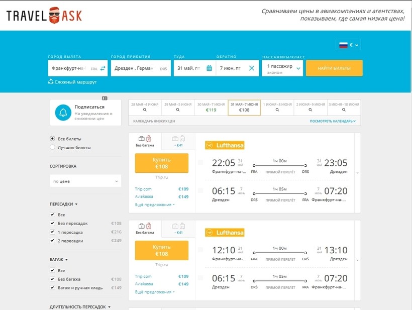У авиакомпании Lufthansa билеты в обе стороны стоят 101 €.