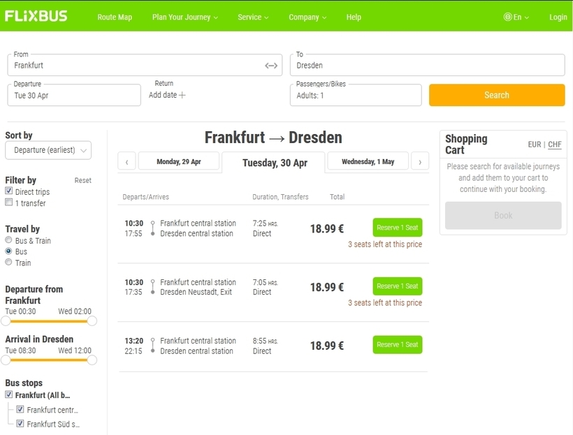 Билет на автобус Франкфурт — Дрезден стоит 18,99 €.