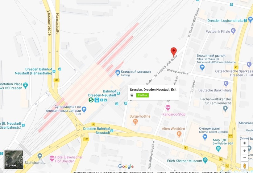 Второй утренний рейс приходит на остановку Dresden Neustadt Exit. Эта остановка находится позади железнодорожного вокзала Bahnhof Dresden-Neustadt, на маленькой улочке Dr.–Friedrich–Wolf–Strasse.