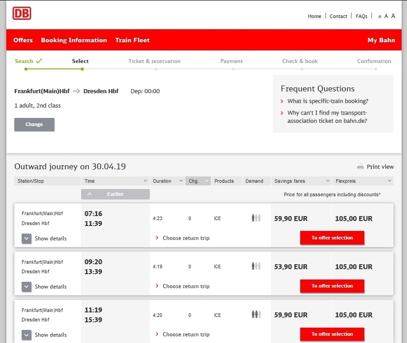 От Франкфуртского центрального вокзала 5 раз в день идут прямые поезда в Дрезден. Интервал между поездами — 2 часа. Первый поезд уходит в 7:16 утра. Последний поезд уходит в 15:20.