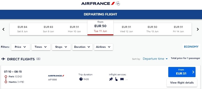 Маршрут Париж — Нант обслуживает компания Air France. Перелеты осуществляются ежедневно. График вы найдете на сайте этой компании.