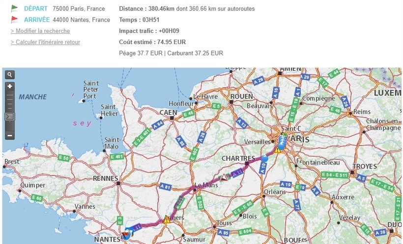 Расстояние между Парижем и Нантом составляет 342 километра или 213 миль по прямой и 380 километров или 236 миль по автодорогам.