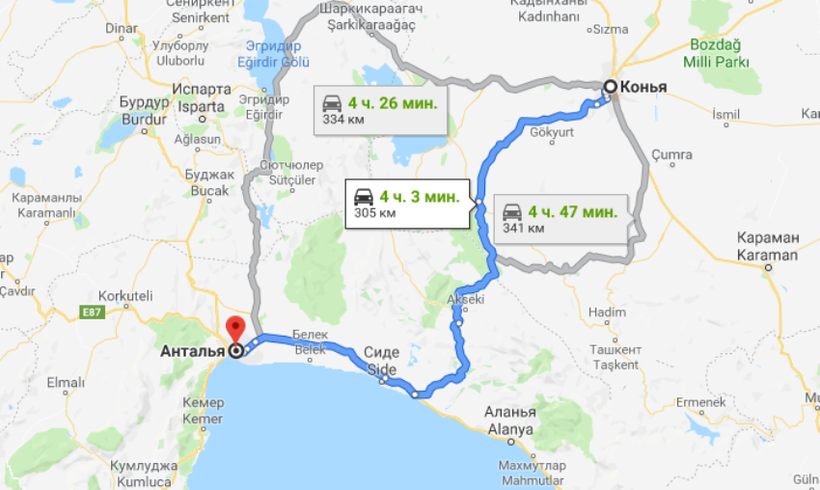 Самый короткий путь из Коньи в Анталью проходит по следующим трассам: