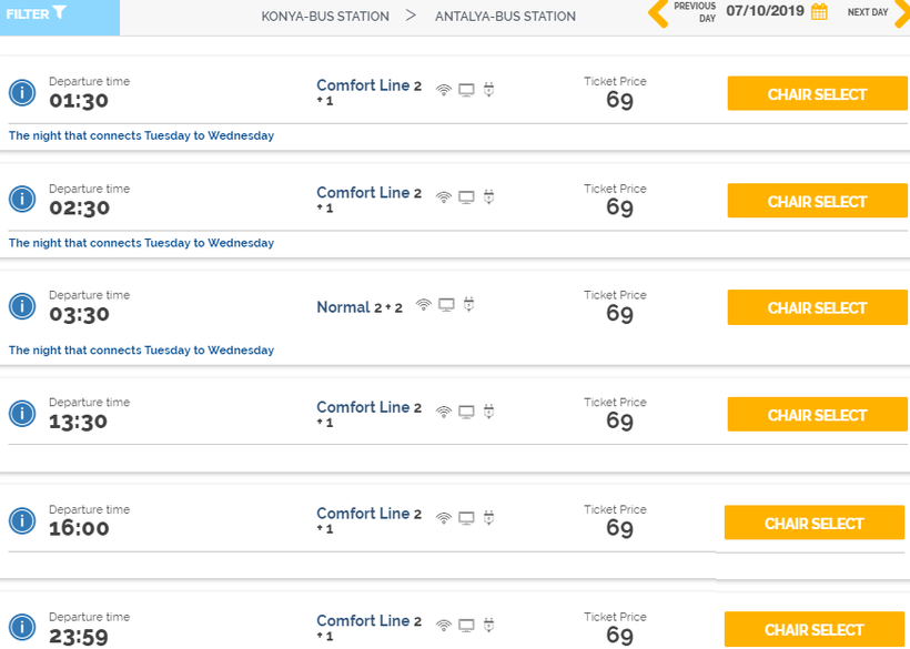 Мне уже неоднократно доводилось путешествовать по Турции на автобусах компаний Kâmil Koç и Metro, нужно отдать должное состоянию и оснащению их автопарка — автобусы современные, с телевизорами, бесплатным Wi-Fi и розетками. Поэтому поездка в Анталью будет неутомительной.