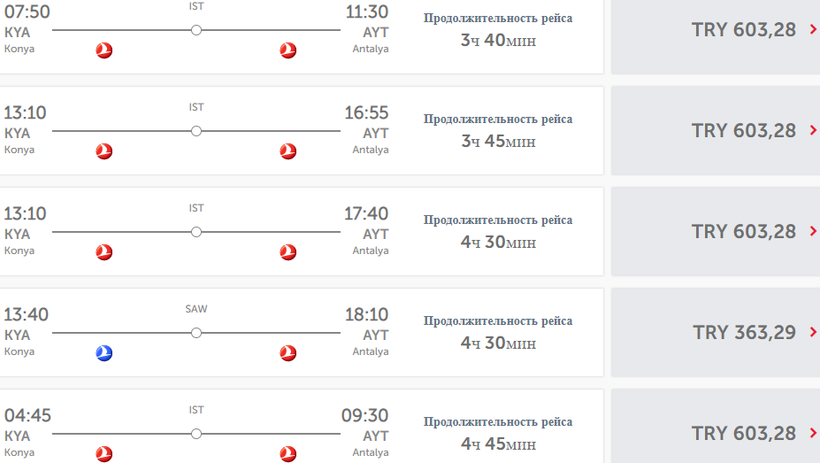 Авиабилет из Коньи в Анталью стоит от 361 турецкой лиры (3900 рублей).