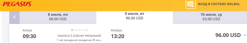 Пересадка происходит в аэропортах Стамбула, перелет с учетом времени пересадки займет от 4 часов. Например, по вторникам можно из Коньи вылететь самолетом Pegasus Airlines в 09:30 и прибыть в аэропорт Антальи в 13:20.