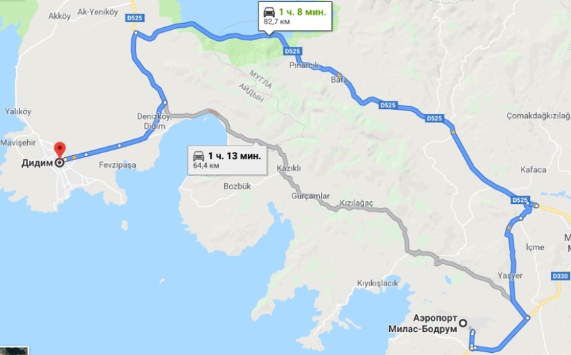 Расстояние от Бодрума до Дидима — 83 км, поскольку прямого автобусного сообщения между городами нет, я рекомендую ехать из аэропорта на такси, это займет 1,5 часа. Но поездка будет не самой дешевой — обойдется примерно в 40 евро (260 турецких лир или 2940 рублей).