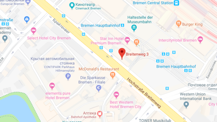 Путь до Бремена автобус преодолевает за 14 часов, и прибывает он в точку назначения в 10:00 на Breitenweg 3.