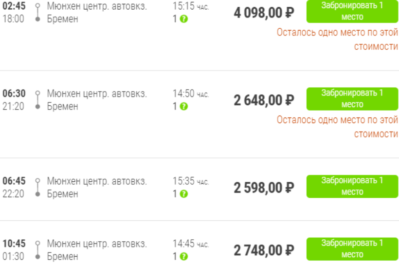 Ну а в случае, если время выезда из Мюнхена прямого автобуса вас не устраивает, можно в Бремен ехать с пересадками, что займет 15–16,5 часов.