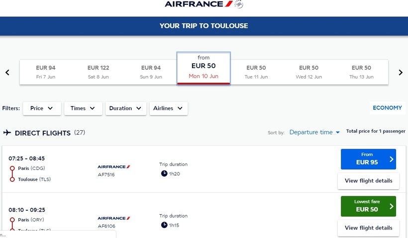 В Тулузу из Парижа я летела на самолете компании Air France. Рейсов от других авиаперевозчиков я не нашла.