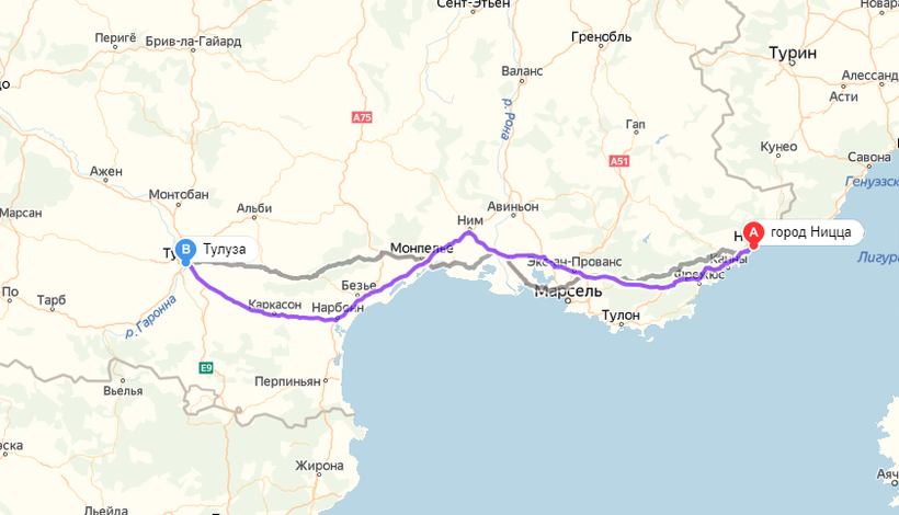 Расстояние между Тулузой и Ниццей составляет 469 километров или 291 миля по прямой и 561 километр или 348 миль по автодорогам.
