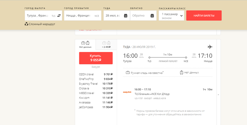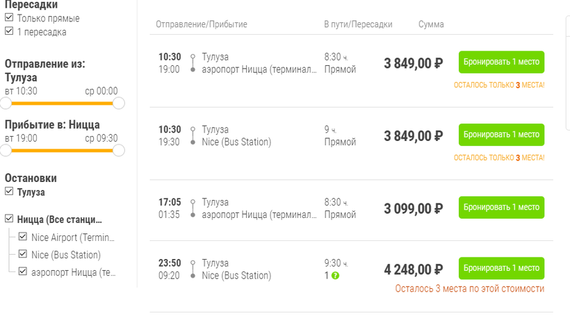 Ниже приведена информация о том, сколько часов вам потребуется, чтобы добраться от Тулузы до Ниццы, а также приведена примерная стоимость проезда (средняя цена билета) на том или ином виде транспорта.