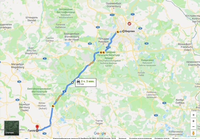 Берлин — Галле — маршрут на карте