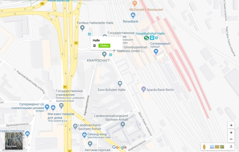 Приезжают автобусы на автостанцию Halle на Ernst-Kamieth-Straße, она находится рядом с ж/д вокзалом.