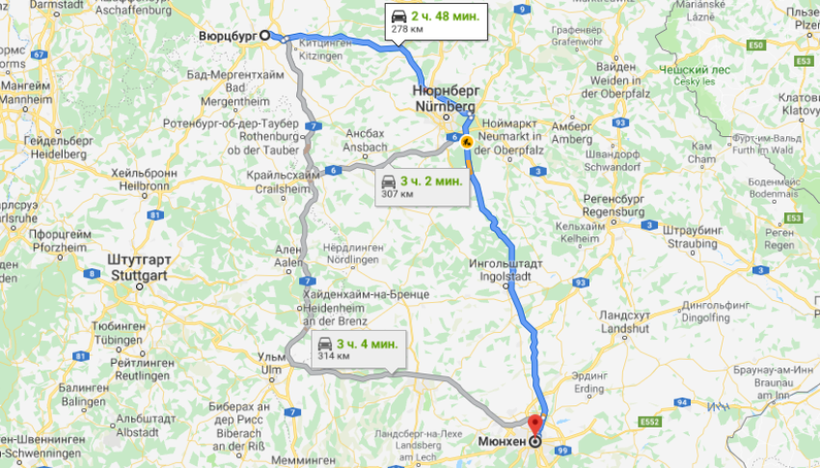 Путь из Вюрцбурга в Нюрнберг лежит по четырехполосному автобану № 3, а из Нюрнберга в Мюнхен по шестиполосному автобану № 9. Все дороги в Германии отличного качества, на них нет скоростных ограничений. А еще плюс такого путешествия на машине в том, что в Германии совсем нет платных дорог.