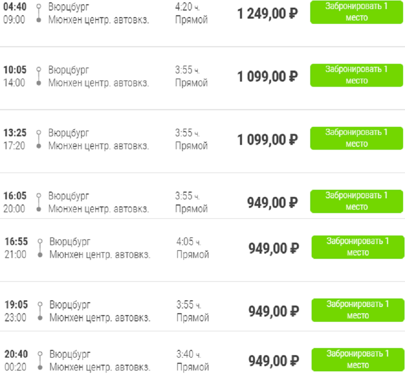 Поездка из Вюрцбурга в Мюнхен на автобусе обойдется от 13 евро или 950 рублей.