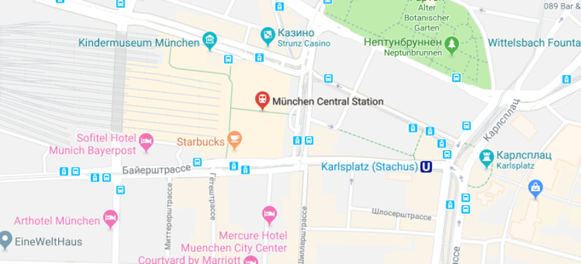А в Мюнхене поезда прибывают на главный ж/д вокзал на Bayerstraße 10A.
