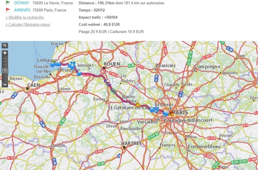 Расстояние между Гавром и Парижем составляет 110 километров или 68 миль по прямой и 216 километров или 134 мили по автодорогам.