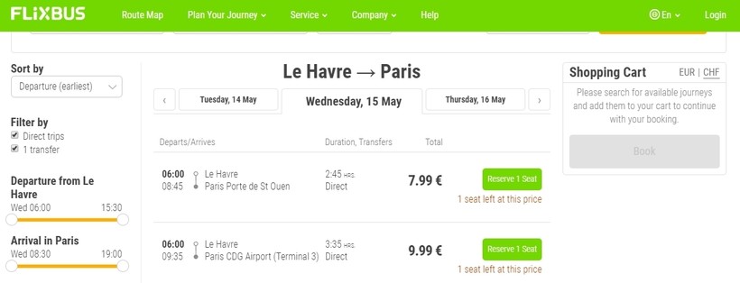 Ниже приведена информация о том, сколько часов вам потребуется, чтобы добраться от Гавра до Парижа, а также приведена примерная стоимость проезда (средняя цена билета) на том или ином виде транспорта.