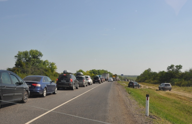 Небольшой затор был в Воронежской области. Движение в один ряд - недалеко идет строительство широкой трассы.