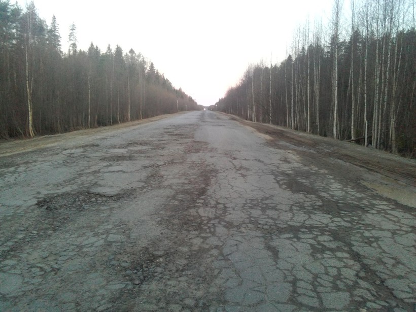 Рано утром отправился снова в бой. Далее были ещё около 20 км тех же глубоких ям и колдобин, присыпанных песочком. После Котласа состояние асфальта значительно улучшилось, и уже до самого Сыктывкара я ехал, не снижая темпа.