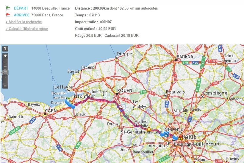 Расстояние между Довилем и Парижем составляет 108 километров или 67 миль по прямой и 200 километров или 124 мили по автодорогам.