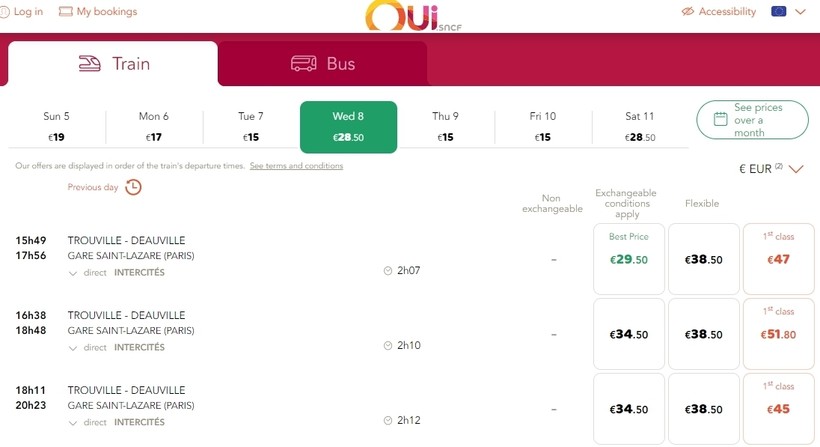 Ежедневно доступно 6–7 прямых рейсов. График можно посмотреть на сайте SNCF. Ребята, это стоит делать, ведь интервал движения поездов составляет около двух часов. Не так часто ходит этот транспорт, как хотелось бы. Если доступа в интернет во время путешествия не будет, тогда можно обращаться в информационное бюро на вокзале Trouville-Deauville. Кстати, оттуда и отправляются поезда в Париж.