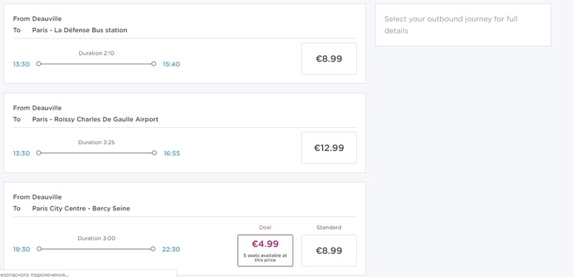 Ниже приведена информация о том, сколько часов вам потребуется, чтобы добраться от Довиля до Парижа, а также приведена примерная стоимость проезда (средняя цена билета) на том или ином виде транспорта.