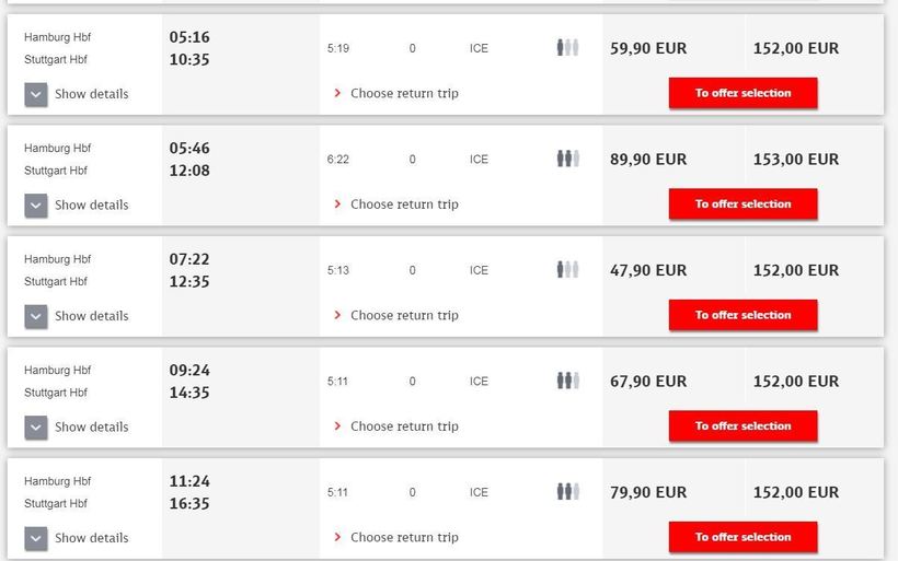 Чтобы узнать расписание движения поездов в Штутгарт, предлагаю посетить сайт немецкого железнодорожного оператора. Вот скриншот оттуда с частью расписания: