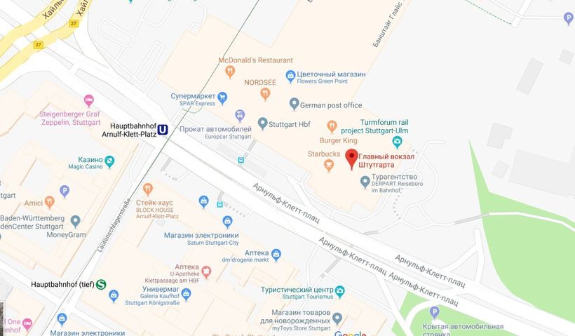 Прибывают все поезда на главный ж/д вокзал Штутгарта, расположенный по адресу Arnulf-Klett-Platz 2.