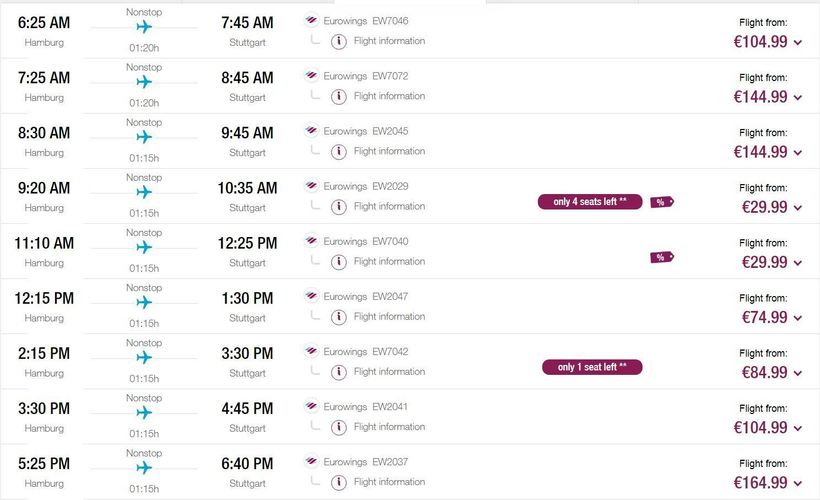 Авиарейсы по данному направлению обеспечивает авиакомпания Eurowings. Вот скриншот расписания с её сайта: