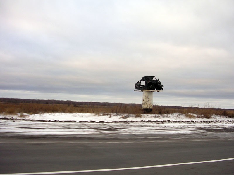 Вдоль дороги то и дело попадаются памятники нерадивым водителям в виде искореженных остовов автомобилей.