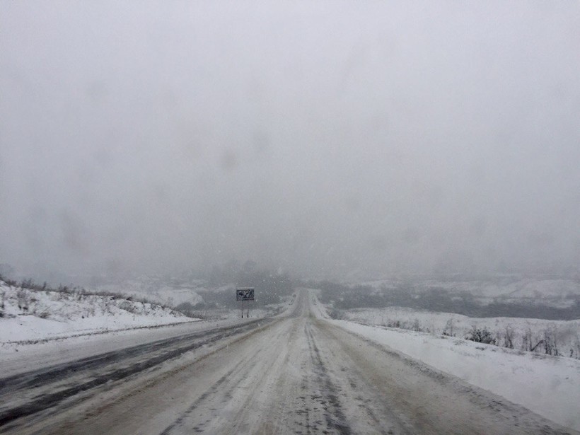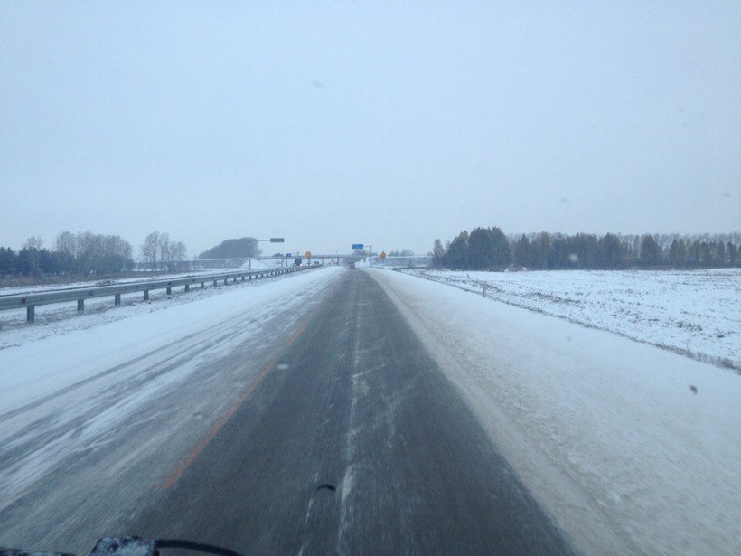 Спустя несколько часов видимость стала значительно лучше и можно было немного прибавить газу. На трассе снегу не много, но я ехал осторожно. Само дорожное покрытие в нормальном состоянии, а вот разметку в некоторых местах не видно вовсе.