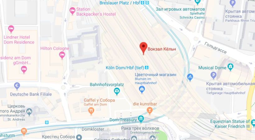 В Кёльн поезда прибывают на главный ж/д вокзал на Trankgasse 11.