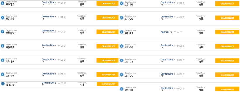 Несмотря на довольно продолжительное время в пути, поездка на автобусе будет комфортной, ведь автобусы у обеих компаний современные, с интернетом, розетками для подзарядки гаджетов, а также со встроенными в кресла телевизорами. Но все же, выбирая время отправления автобуса, советую отдать предпочтение ночным рейсам, чтобы прибыть на курорт утром.