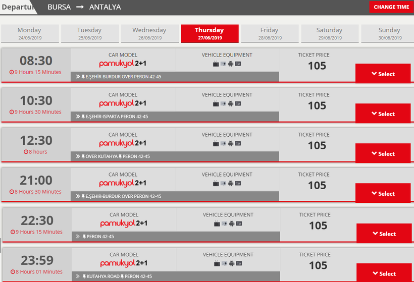 Компания Pamukkale выполняет рейсы немного реже, ее автобусы отправляются из Бурсы в Анталью ежедневно в: