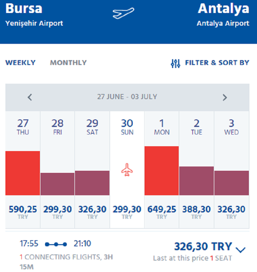 Авиаперелет из Бурсы в Анталью обойдется от 326 турецких лир (50 евро или 3600 рублей).