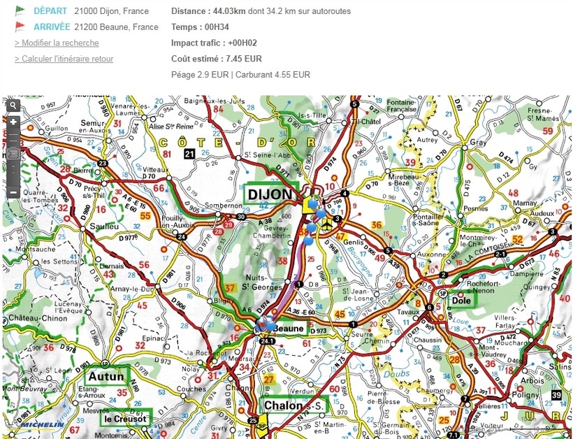 Расстояние между Дижоном и Боном составляет 36 километров или 22 мили по прямой и 46 километров или 29 миль по автодорогам.