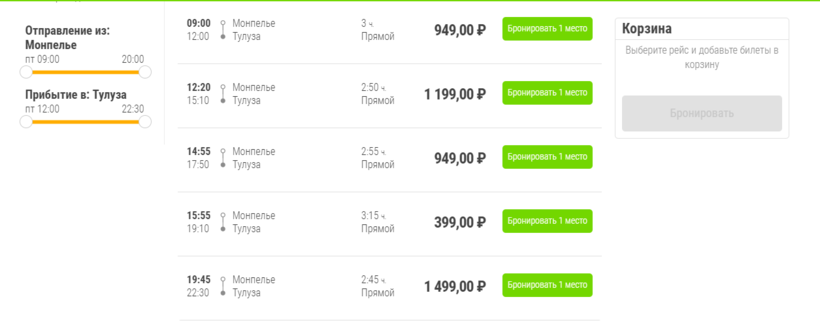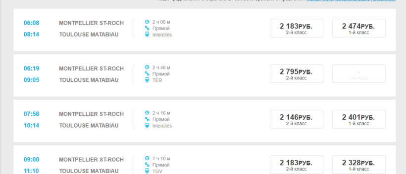 Первый рейс отправляется в 6 утра, а последний — в 20:08. Поезда доезжают в Тулузу за 2 часа.Сколько стоит билет