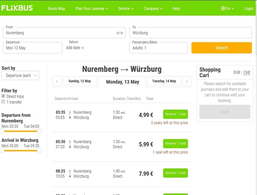 Уехать из Нюрнберга в Вюрцбург на автобусе можно раз 10–12 в день.
