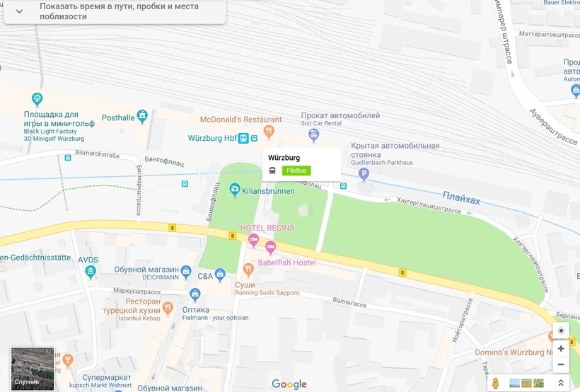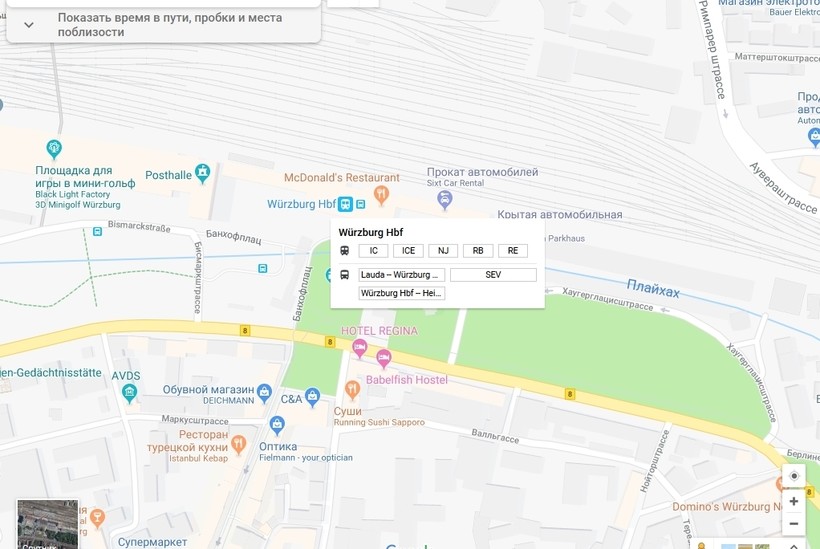Я выехала из Нюрнберга по Rothenburger Straße на трассу А73, затем на развязке Fürth/Erlangen свернула на А3. По автобану А3 я ехала почти всю дорогу, ну, 80 км точно. Только возле Бибельрида, на перекрестке, я съехала на дорогу В8. Доехала до следующего перекрестка, где свернула на Walterstraße, по которому въехала в Вюрцбург.