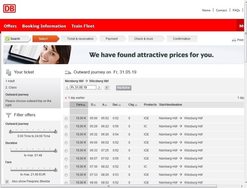 Большинство поездов, идущих из Нюрнберга в Вюрцбург, это скоростные (ICE или IC), но есть и региональные поезда (RE), только они идут реже (раз в час). Продолжительность поездки от 50 до 70 минут.