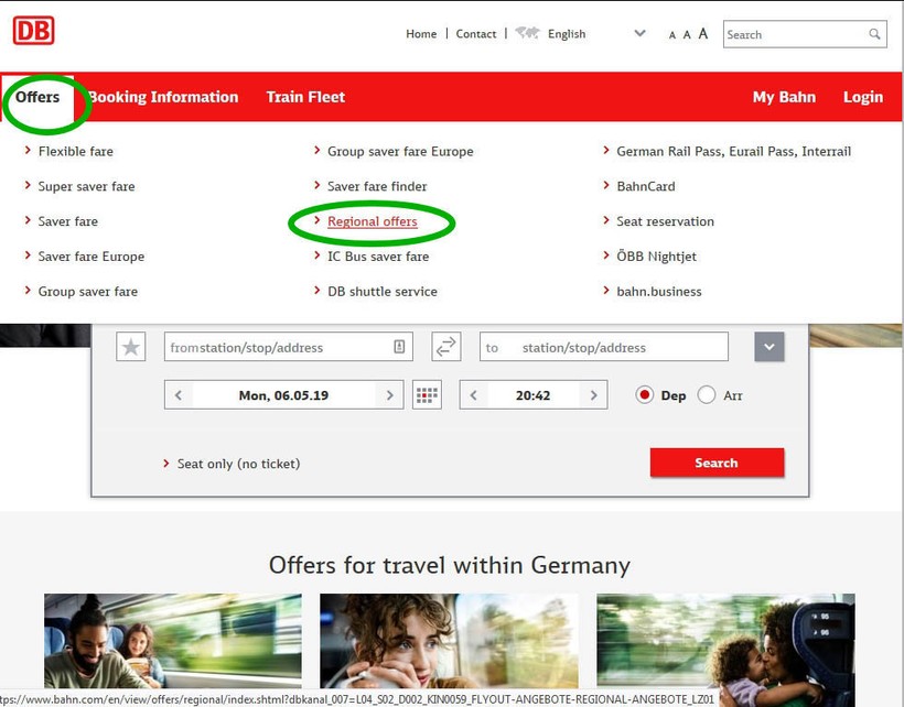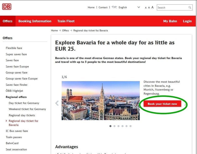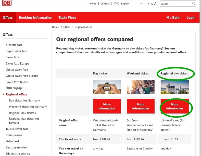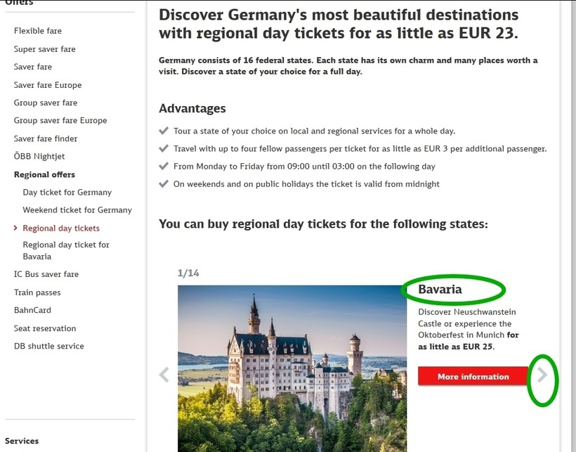Баварский билет я покупала все через тот же сайт немецкого железнодорожного оператора. На главной странице нужно зайти в меню «Offers» выбрать строку «Regional offers».