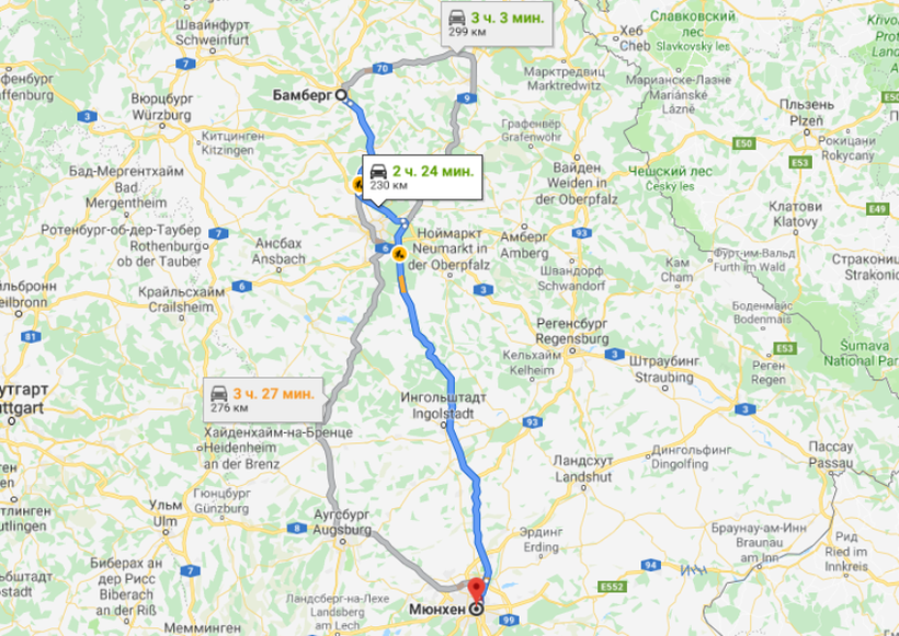 Бамберг и Мюнхен разделяют всего 230 км, которые преодолеть за рулем автомобиля по хорошим немецким автобанам можно за 2,5 часа.