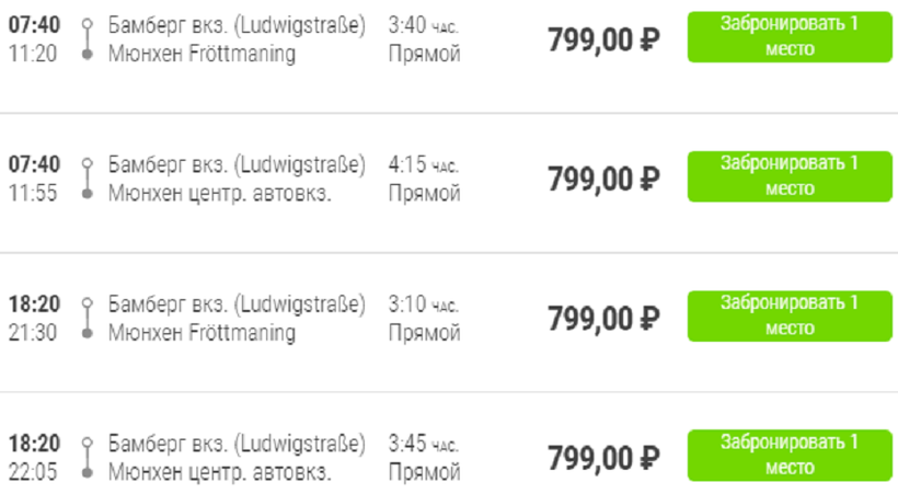 Ежедневно из Бамберга в Мюнхен отправляются автобусы FlixBus в 07:40 и 18:20.