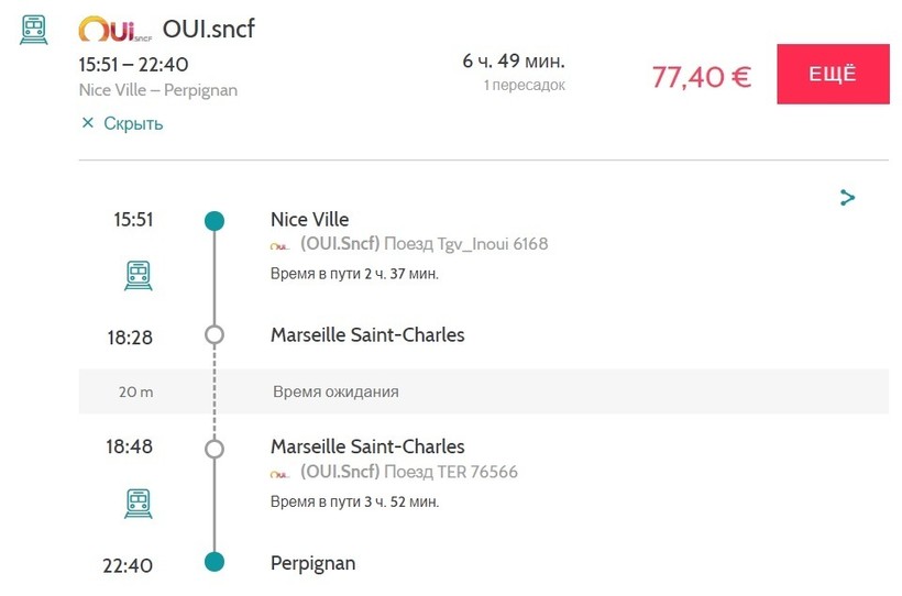 Из Ниццы в этот атмосферный городок вы можете добраться на комфортабельном поезде. Нужно будет сделать пересадку в Марселе. В дороге проведете от 7 до 8,5 часов. На скриншоте представлен один из вариантов.