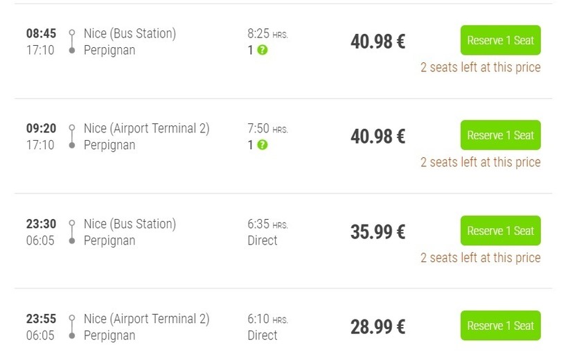 Этот вариант также возможен. Из Ниццы в Перпиньян ходят автобусы известной европейской компании Flixbus. На скриншоте указано актуальное расписание.