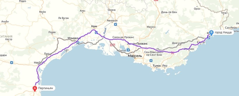 По трассе между этими населенными пунктами почти 500 километров. Расстояние приличное. Если будете ехать с минимальными остановками, то в Перпиньян доберетесь примерно через 6 часов.